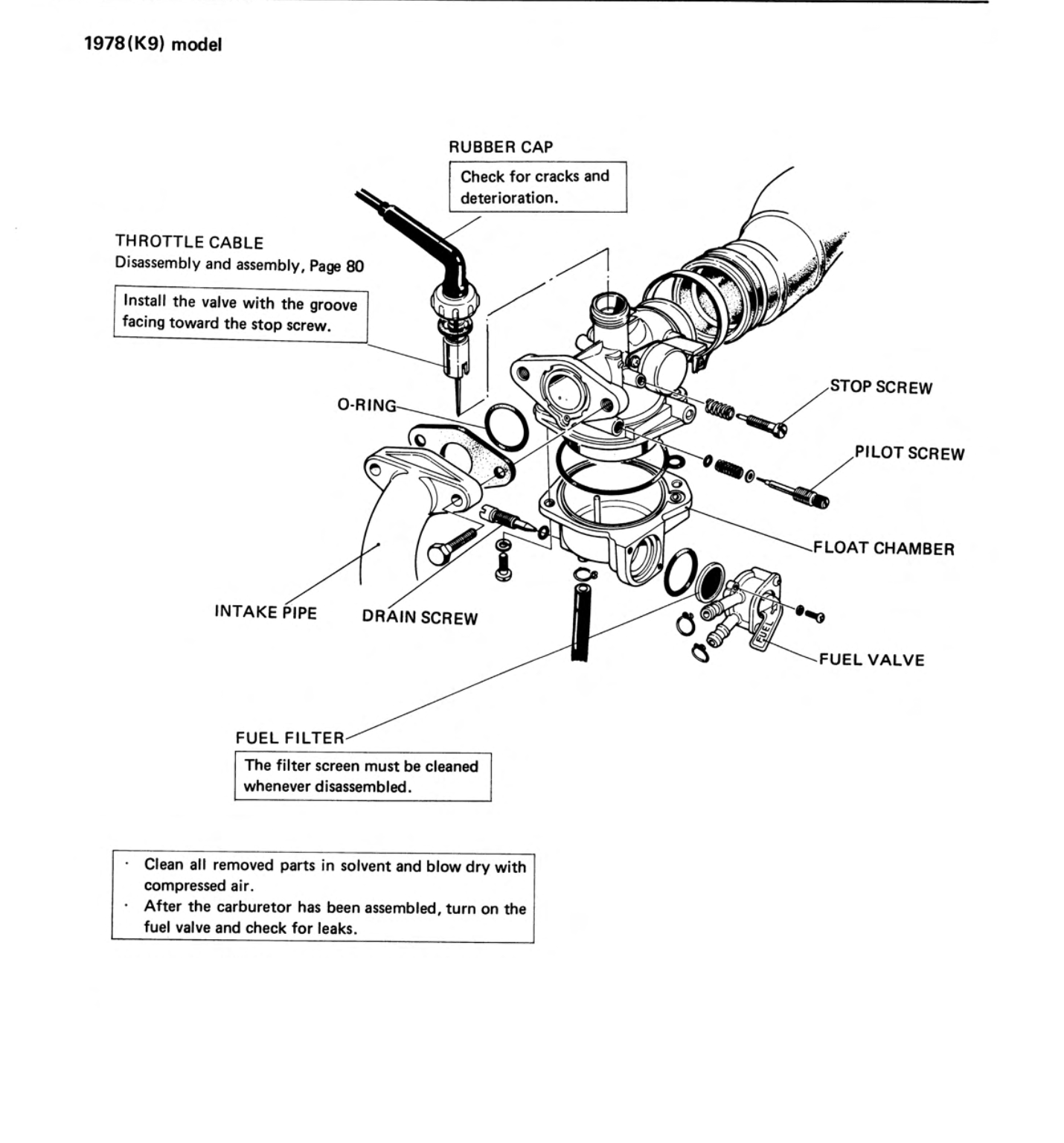 *note: the K9A used a 78 jet, which apparently was to rich and replaced with a #62 in the K29A. Although several parts lists reference a #62 main jet for the 1969-77 bikes, at least one shows the change to a #65 during the run of K2 models: