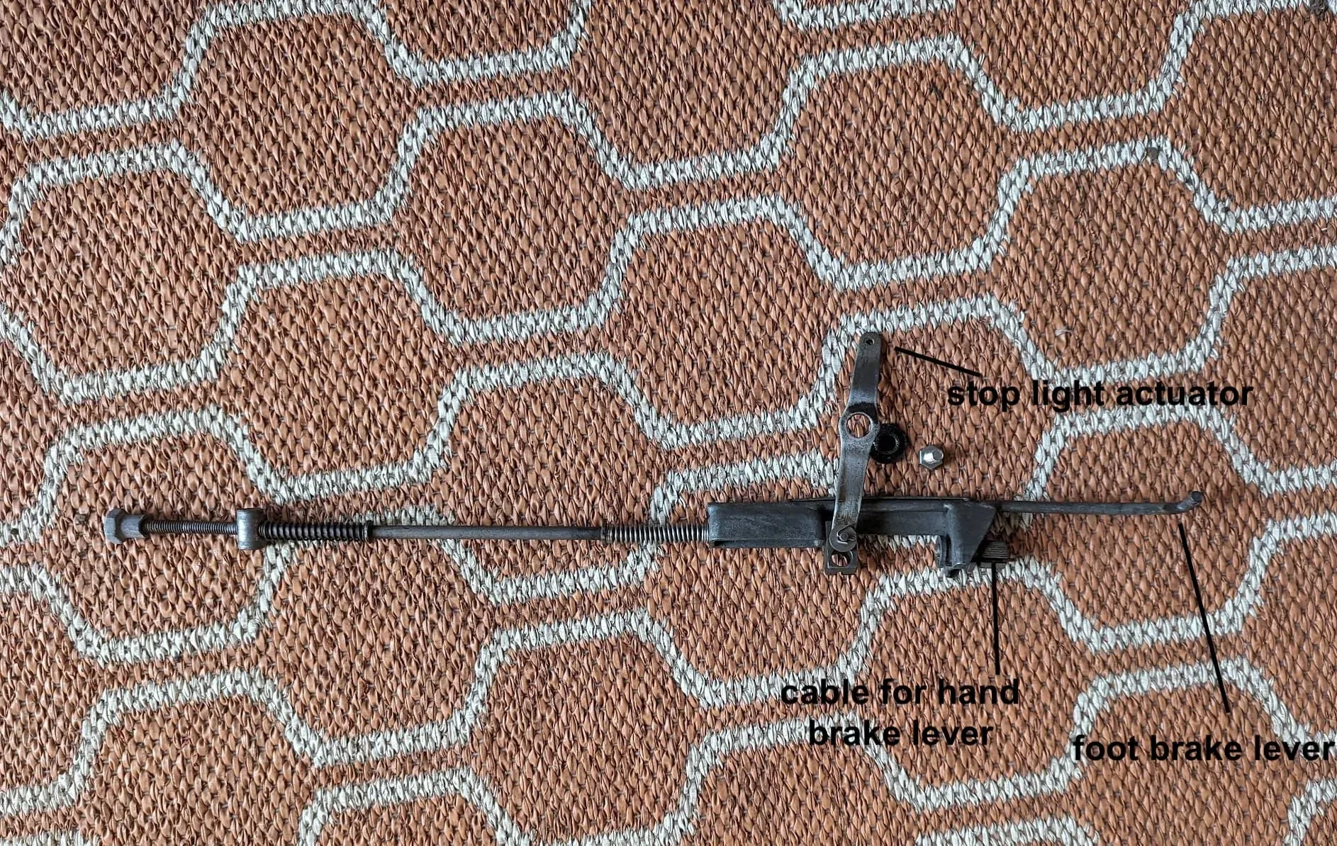 The rear brake in the early CT90s can be both hand and foot operated - handy when trying to control your speed when paddling down a steep hill. Another elaborate mechanism is used to ensure the rear brake light is activated by both the foot and hand brake: